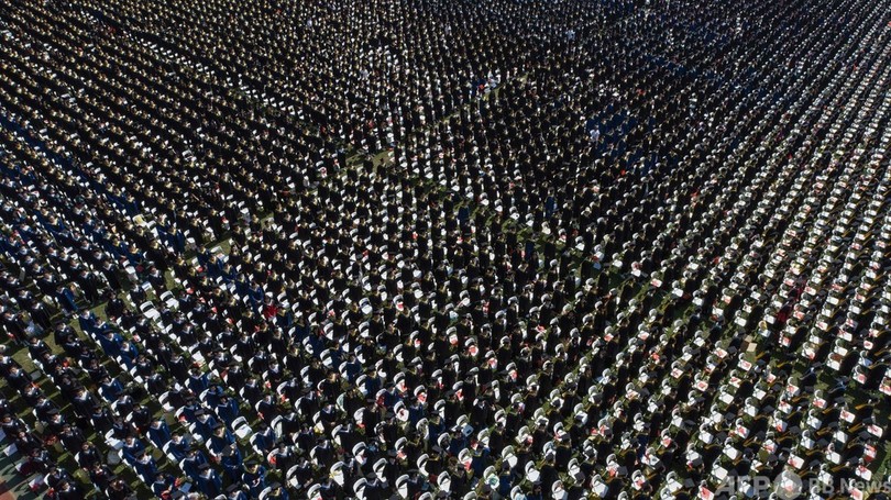 会場には中国共産党結党100年を祝うプレートが準備され、これを前に卒業生らが並び、記念撮影が行われた。多くの手には中国国旗が握られていた。(c)AFP