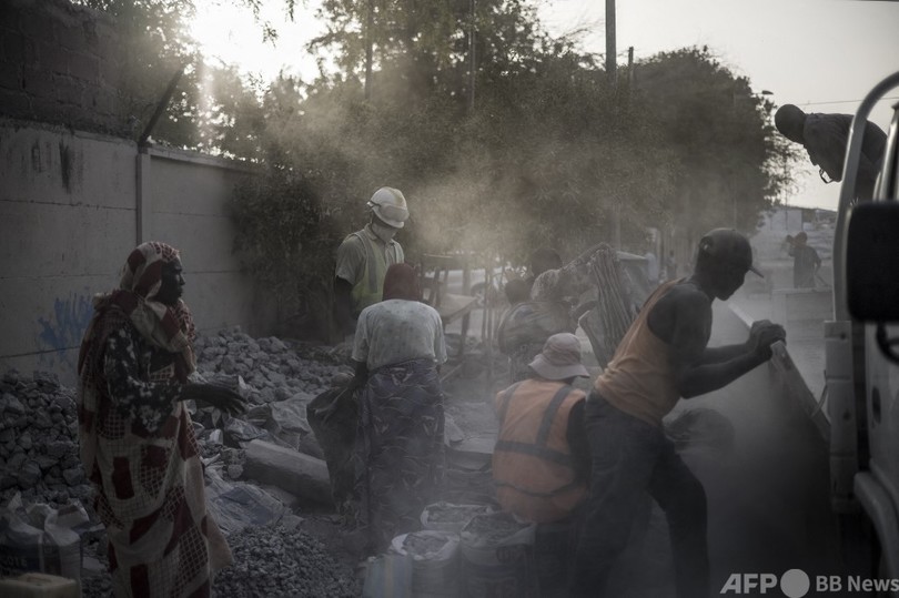 高温と粉じん マスク無しで建設廃材を砕く女性たち チャド
