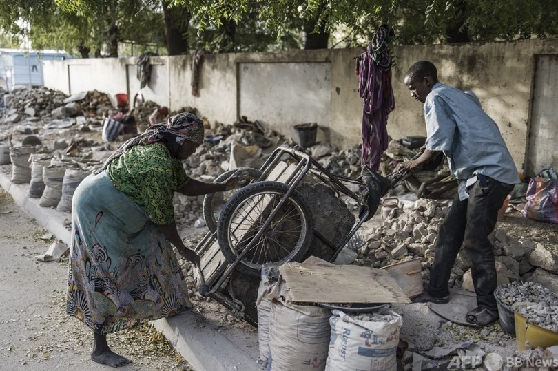 高温と粉じん マスク無しで建設廃材を砕く女性たち チャド