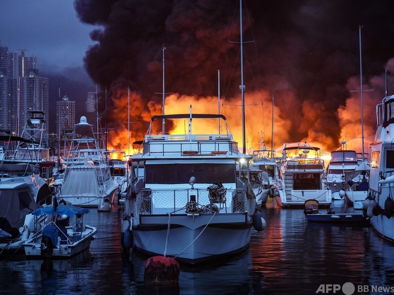 火災が起きたのは、台風襲来時の避難港となっている香港仔避風塘(Aberdeen Typhoon Shelter)。炎上した船の多くは、香港人や外国人が普段から住居として使用していた。消防当局によると、火は約6時間後に消し止められた。(c)AFP