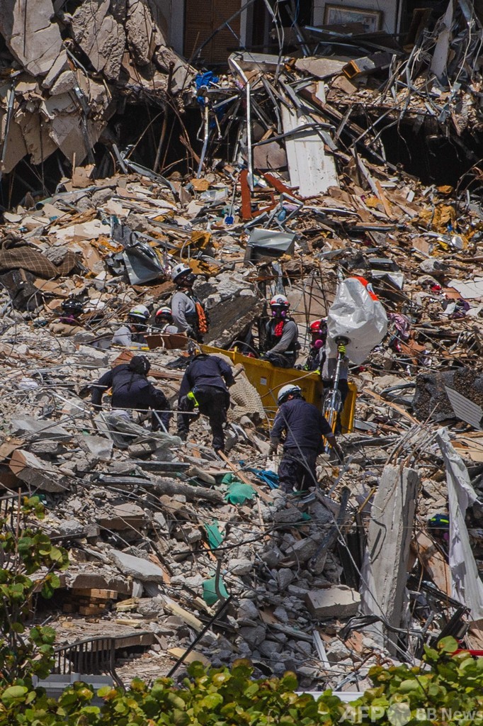 25日夜に地元当局が公表した2018年10月の報告書では、事故が起きた築40年の12階建て集合住宅「チャンプレイン・タワーズ・サウス(Champlain Towers South)」にはプール周辺の下のコンクリート層から駐車場の柱や梁(はり)にかけて「大きな構造上の損傷」がある恐れを指摘し、修理の必要があると結論。建物は近く修理が行われる予定だった。