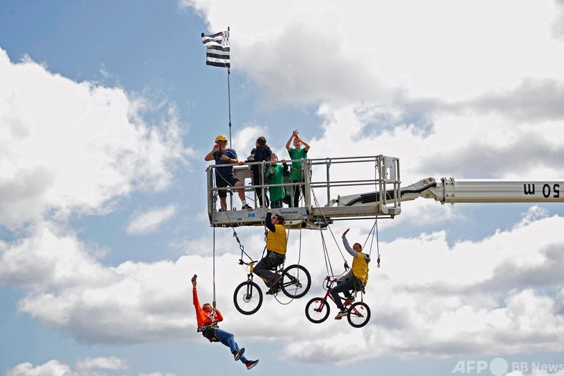 【7月6日 AFP】ツール・ド・フランス(2021 Tour de France)第2ステージ(ペロスギレックからミュールドブルターニュゲルレダン、183.5キロメートル)間で、クレーンでつるされた高所から観戦する観客ら。(c)AFP