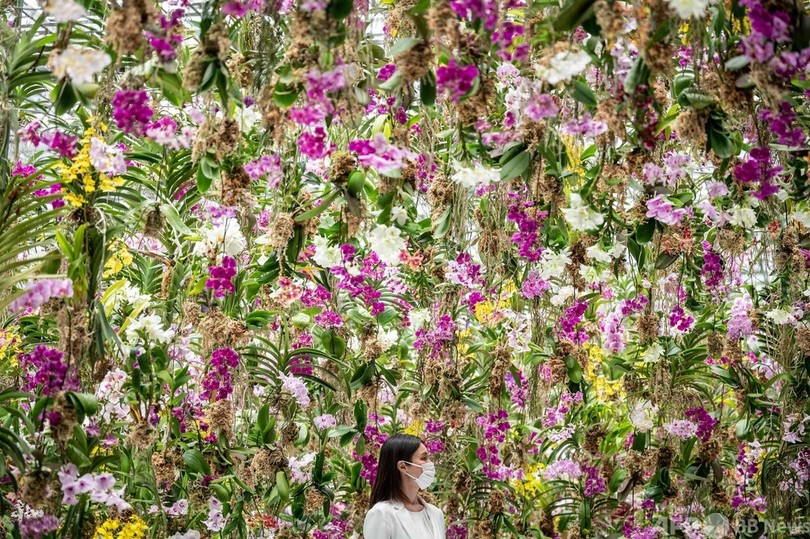 その一部「Floating Flower Garden: 花と我と同根、庭と我と一体」では、1万3000本のランの花が上下に動き、中にいる人が完全に花に囲まれる空間を演出している。(c)AFP
