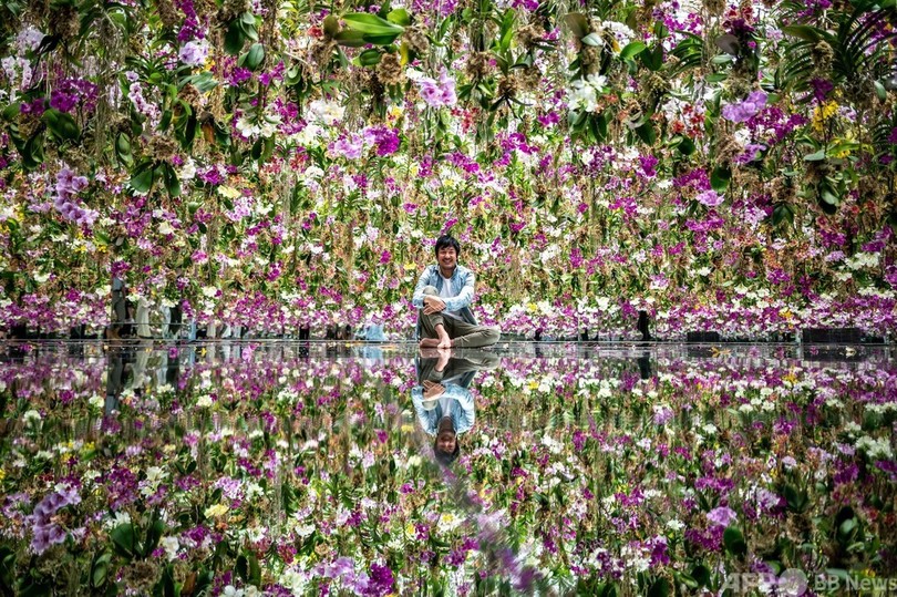 その一部「Floating Flower Garden: 花と我と同根、庭と我と一体」では、1万3000本のランの花が上下に動き、中にいる人が完全に花に囲まれる空間を演出している。(c)AFP