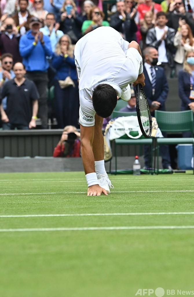 「観客と良いつながりを築けている」と話したジョコビッチは、「芝とも本当に良い関係がつくれているようだ。過去のウィンブルドンで最初の2セットにこれほど倒れたのは記憶にない」と続けた。(c)AFP