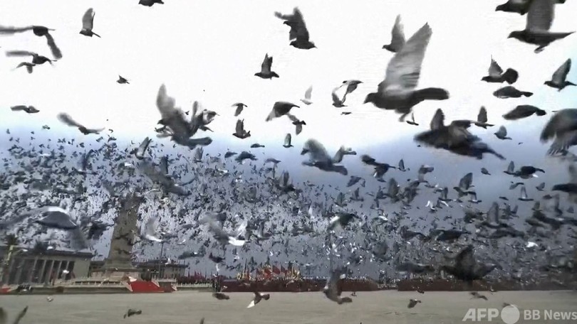 天安門広場で放たれた10万羽の伝書バトは中国伝書鳩協会の募集により会員が無償提供したものです。その中から健康で聡明(そうめい)、家に戻ることができ、見た目の良いハトだけが選ばれました。会員によりますと、放たれたハトは速やかに各自の家に向かい、最も早いものは1、2分後に家に着いたということです。(c)CGTN Japanese/AFPBB News