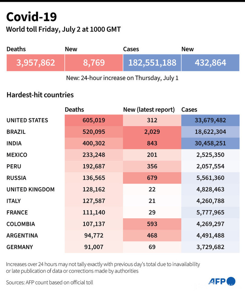 【7月3日 AFP】AFPが各国当局の発表に基づき日本時間2日午後7時にまとめた統計によると、世界の新型コロナウイルスによる死者数は395万7862人に増加した。