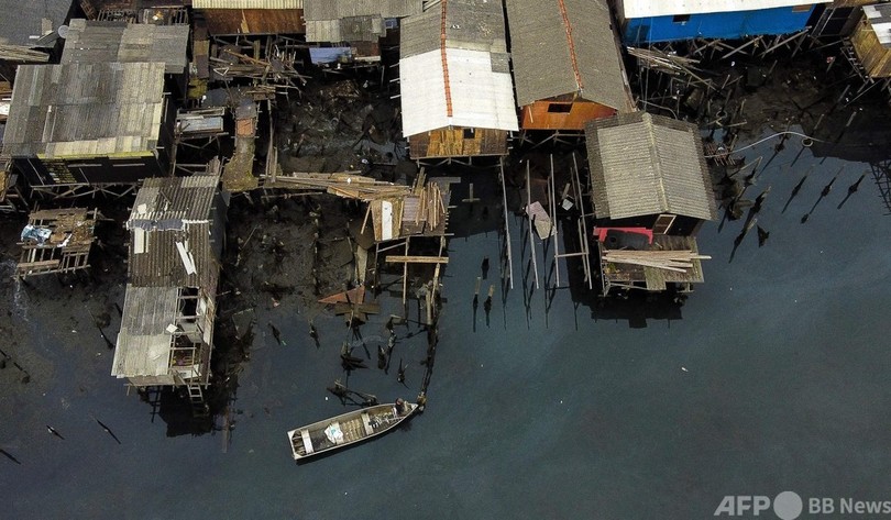 【7月12日 AFP】マングローブの生える水面から突き出た、細い材木を脚にして立つ家々。