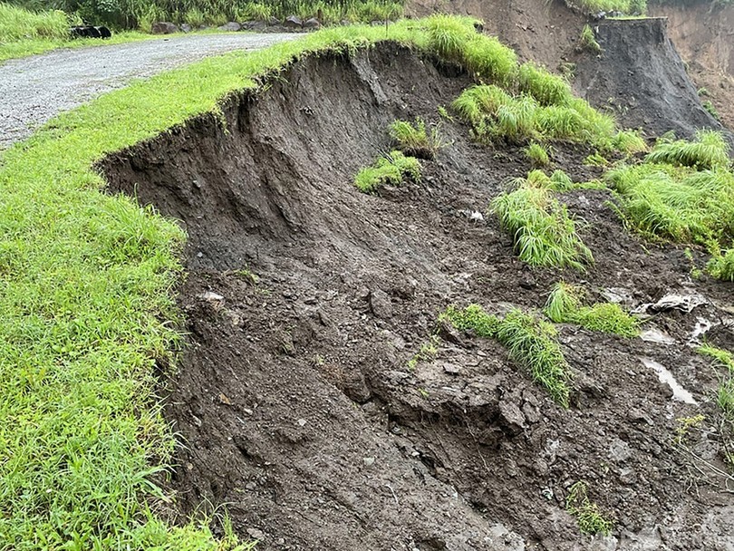 ヘリコプターで上空から撮影した画像では、土砂とがれきが蛇行しながら斜面を流れた跡が確認できる。