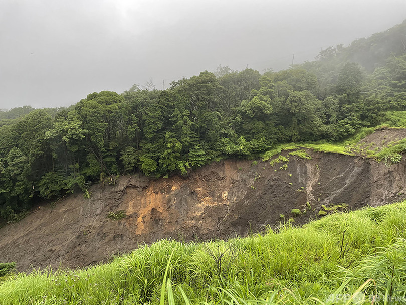 ヘリコプターで上空から撮影した画像では、土砂とがれきが蛇行しながら斜面を流れた跡が確認できる。