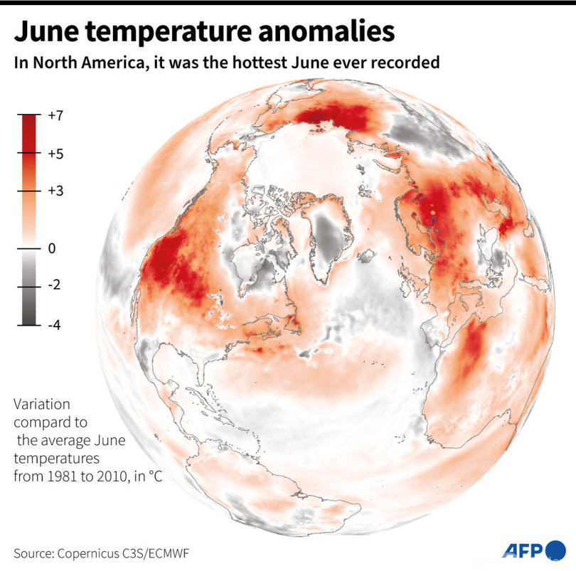ニュース 環境・科学 SDGs 気候変動に 具体的な対策を 先月の北米、観測史上最も暑い6月に 2021年7月7日 16:33 発信地:パリ/フランス [ フランス ヨーロッパ 北米 ] このニュースをシェア ‹ › ❮ 2/2 ❯ 2021年6月の世界の気温を示した図(2021年7月7日作成)。(c)Simon MALFATTO, Jonathan WALTER / AFP 画像作成中 ! 【7月7日 AFP】先月は猛烈な熱波の影響で、北米で観測史上最も暑い6月となったと、欧州連合(EU)のコペルニクス気候変動サービス(C3S)が7日、発表した。C3Sは、地球温暖化の影響の表れだとしている。北米の6月の平均気温は、1991~2020年の平均を1.2度上回ったという。(c)AFP 環境・科学 一覧へ> メディア・報道関係・法人の方向け 写真・動画 購入のお問合せ>