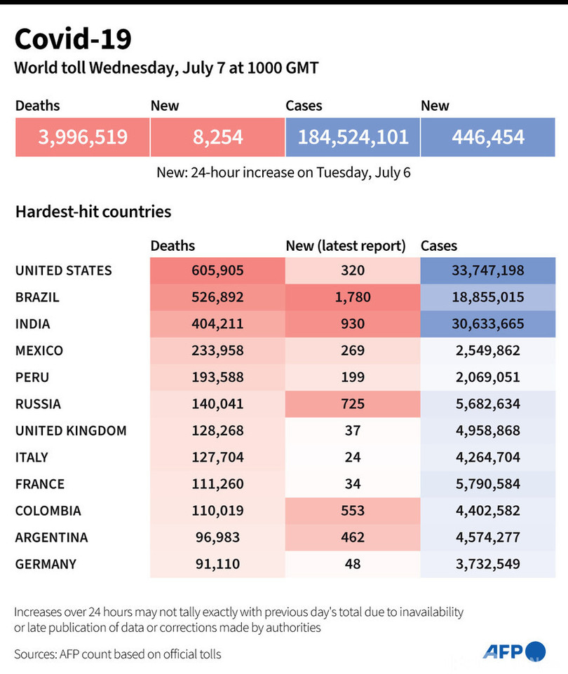 【7月7日 AFP】AFPが各国当局の発表に基づき日本時間7日午後7時にまとめた統計によると、世界の新型コロナウイルスによる死者数は399万6519人に増加した。