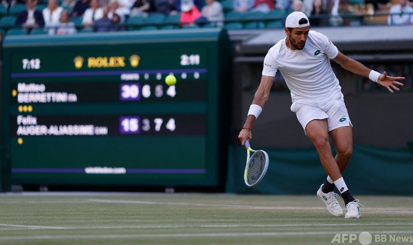 【7月8日 AFP】テニス、ウィンブルドン選手権(The Championships Wimbledon 2021)は7日、男子シングルス準々決勝が行われ、大会第7シードのマッテオ・ベレッティーニ(Matteo Berrettini、イタリア)は第16シードのフェリックス・オジェ・アリアシム(Felix Auger-Aliassime、カナダ)を6-3、5-7、7-5、6-3で下し、準決勝に駒を進めた。