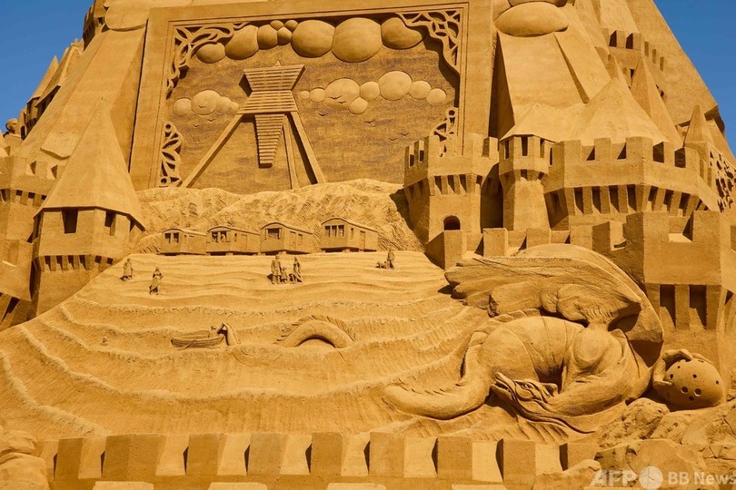 制作には、世界有数の砂像彫刻家30人が参加した。砂が崩れないように粘土を約10%混ぜ込み、完成後に全体をのりで固めた。厳しい霜が降りる来年2月から3月ごろまで形を保てるという。