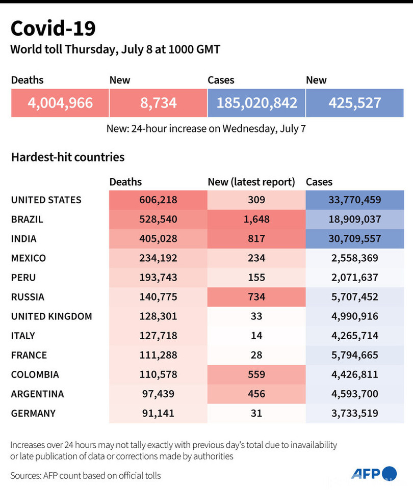 【7月8日 AFP】AFPが各国当局の発表に基づき日本時間8日午後7時にまとめた統計によると、世界の新型コロナウイルスによる死者数は400万4966人に増加した。
