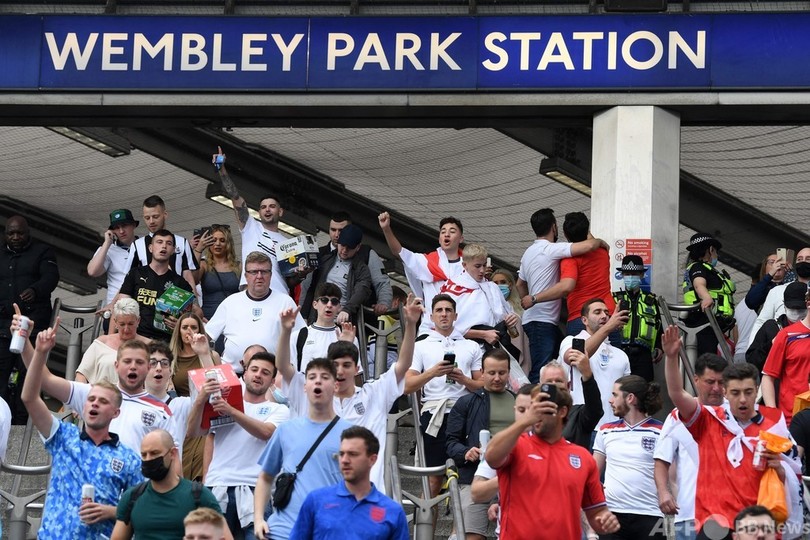 【7月12日 AFP】サッカー欧州選手権(UEFA Euro 2020)決勝、イタリア対イングランドのキックオフを数時間後に控え、大勢の熱狂的なイングランドファンが試合会場となる英ロンドンのウェンブリー・スタジアム(Wembley Stadium)に集結した。