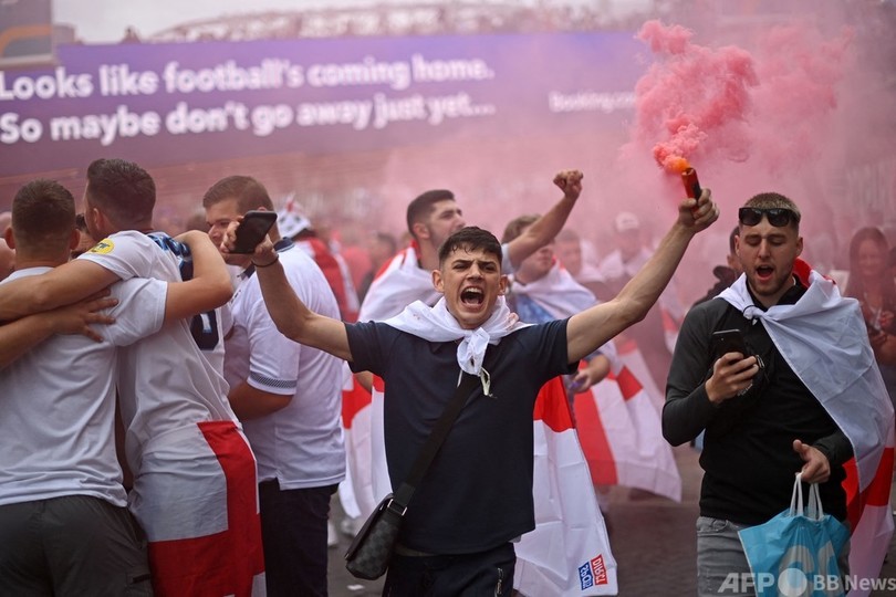 【7月12日 AFP】サッカー欧州選手権(UEFA Euro 2020)決勝、イタリア対イングランドのキックオフを数時間後に控え、大勢の熱狂的なイングランドファンが試合会場となる英ロンドンのウェンブリー・スタジアム(Wembley Stadium)に集結した。