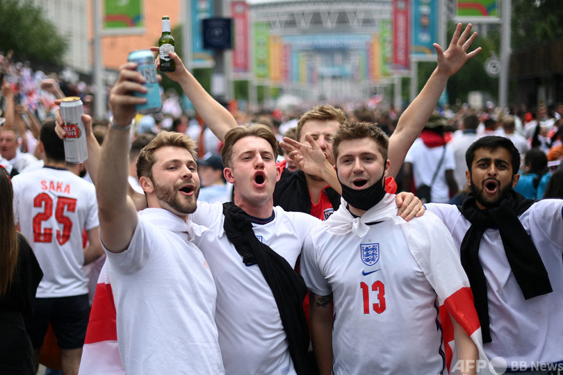 【7月12日 AFP】サッカー欧州選手権(UEFA Euro 2020)決勝、イタリア対イングランドのキックオフを数時間後に控え、大勢の熱狂的なイングランドファンが試合会場となる英ロンドンのウェンブリー・スタジアム(Wembley Stadium)に集結した。