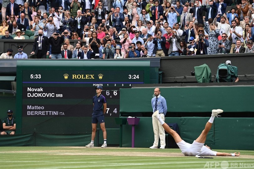 【7月12日 AFP】(更新)テニス、ウィンブルドン選手権(The Championships Wimbledon 2021)は11日、男子シングルス決勝が行われ、大会第1シードのノバク・ジョコビッチ(Novak Djokovic、セルビア)は6-7(4-7)、6-4、6-4、6-3で第7シードのマッテオ・ベレッティーニ(Matteo Berrettini、イタリア)を下して6度目の優勝を果たし、男子歴代最多タイの四大大会(グランドスラム)通算20勝目を飾った。