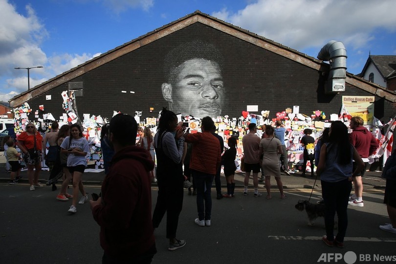 英マンチェスター・ウィジントン(Withington)地区にある同選手の壁画には落書きが書き込まれたものの、その前には数百人が集まり、心温まるメッセージやイングランドの国旗が掲げられた。