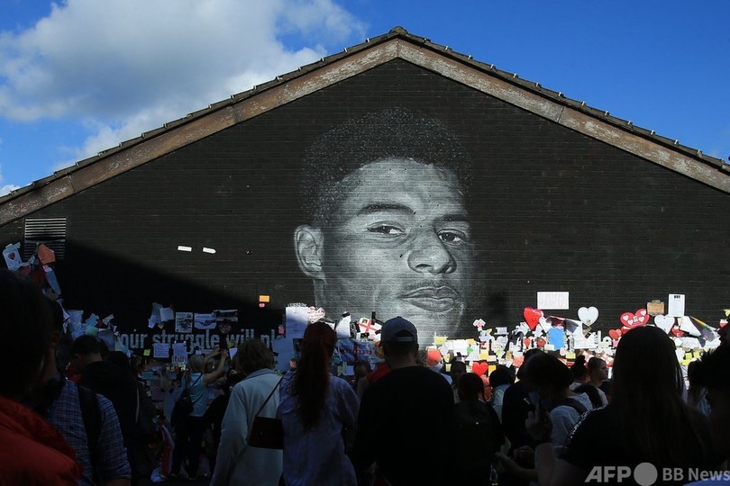 【7月14日 AFP】サッカーイングランド代表のFWマーカス・ラシュフォード(Marcus Rashford)の壁画の前に13日、反人種差別のデモ隊が集結した。