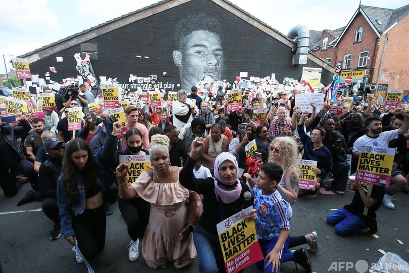 【7月14日 AFP】サッカーイングランド代表のFWマーカス・ラシュフォード(Marcus Rashford)の壁画の前に13日、反人種差別のデモ隊が集結した。
