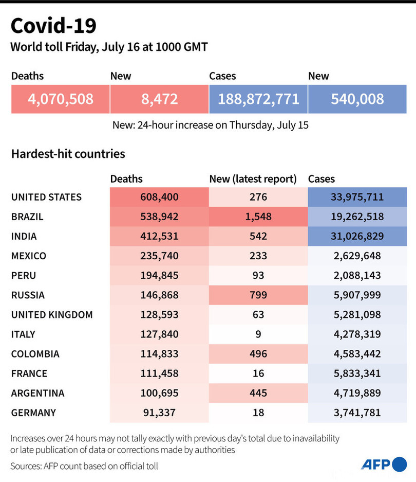 【7月17日 AFP】AFPが各国当局の発表に基づき日本時間16日午後7時にまとめた統計によると、世界の新型コロナウイルスによる死者数は407万508人に増加した。