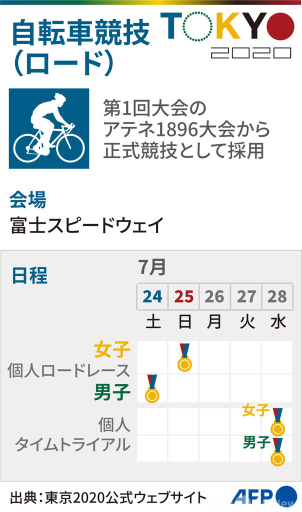 スポーツ スポーツ その他 特集:東京五輪2020 AFPBB コンテンツ 図解 東京五輪:その他 競技 【図解】東京五輪、自転車競技(ロード)の競技日程 2021年7月21日 22:00 発信地:東京 [ 日本 アジア・オセアニア ] このニュースをシェア 東京五輪、自転車競技(ロード)の競技日程についてまとめた図解。(c)AFP 【7月21日 AFP】東京五輪で実施される自転車競技(ロード)の競技日程を図解でまとめた。 自転車競技(ロード)は富士スピードウェイ(Fuji International Speedway)で7月24日、25日、28日の日程で予定されている。(c)AFP 特集:東京五輪2020 8/8に閉幕。日本勢は金メダル27個を含む史上最多となる計58個のメダルを獲得した。 スポーツ その他 一覧へ> メディア・報道関係・法人の方向け 写真・動画 購入のお問合せ>