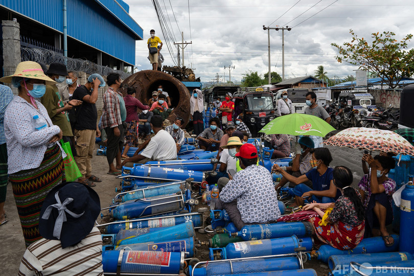 ヤンゴン各地では感染者の家族が大勢、軍事政権による夜間外出禁止令を破り、酸素ボンベを充填(じゅうてん)しようと必死になっている。