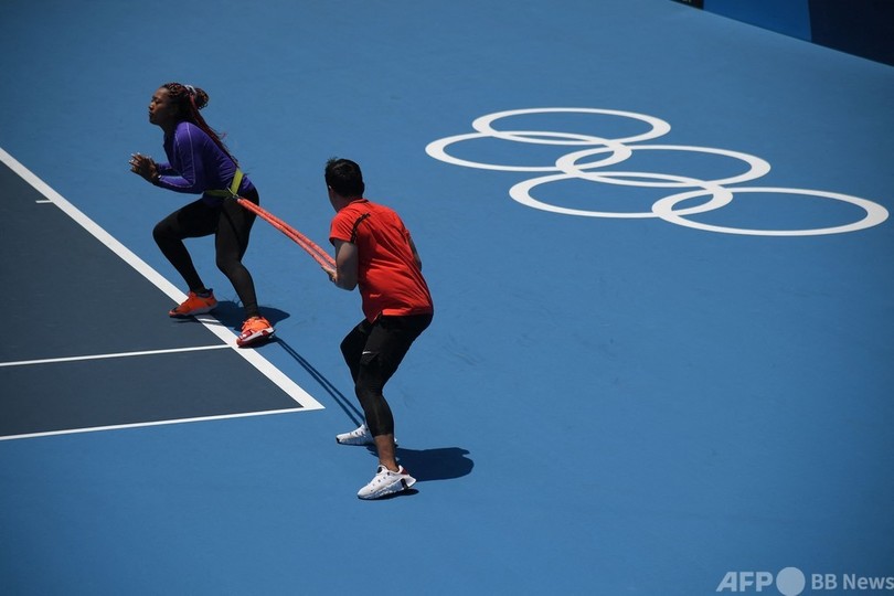 【7月20日 AFP】東京五輪に出場する女子テニスの大坂なおみ(Naomi Osaka)が20日、有明テニスの森公園(Ariake Tennis Park)のセンターコート、有明コロシアム(Ariake Coliseum)で練習を行った。(c)AFP