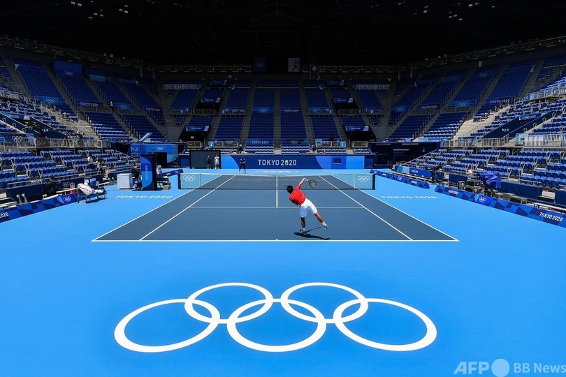 【7月20日 AFP】東京五輪に出場する女子テニスの大坂なおみ(Naomi Osaka)が20日、有明テニスの森公園(Ariake Tennis Park)のセンターコート、有明コロシアム(Ariake Coliseum)で練習を行った。(c)AFP