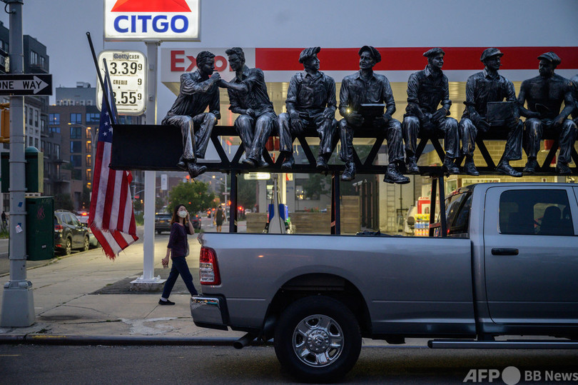 【7月28日 AFP】「摩天楼の頂上でランチ」と題された有名な写真をモチーフにした彫刻を積み、米ニューヨーク・ブルックリン(Brooklyn)のガソリンスタンド前に止まったピックアップトラック。