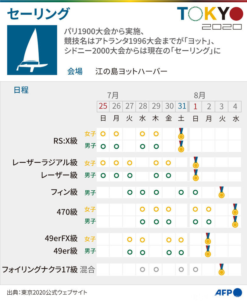 スポーツ スポーツ その他 特集:東京五輪2020 AFPBB コンテンツ 図解 東京五輪:その他 競技 【図解】東京五輪、セーリングの競技日程 2021年7月23日 18:00 発信地:東京 [ 日本 アジア・オセアニア ] このニュースをシェア 東京五輪、セーリングの競技日程についてまとめた図解。(c)AFP 【7月23日 AFP】東京五輪で実施されるセーリングの競技日程を図解でまとめた。 セーリングは江の島ヨットハーバー(Enoshima Yacht Harbour)で7月25日から8月4日までの日程で予定されている。(c)AFP 特集:東京五輪2020 8/8に閉幕。日本勢は金メダル27個を含む史上最多となる計58個のメダルを獲得した。 スポーツ その他 一覧へ> メディア・報道関係・法人の方向け 写真・動画 購入のお問合せ>
