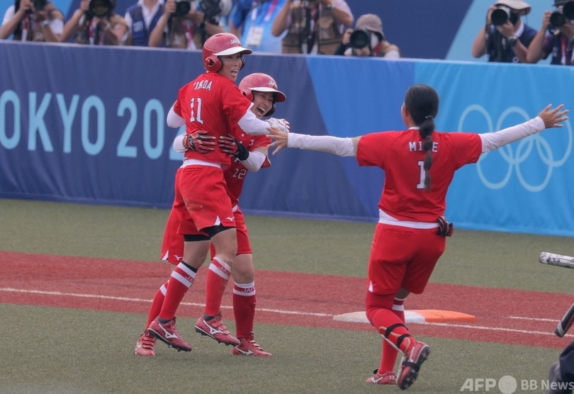【7月22日 AFPBB News】東京五輪は22日、ソフトボール・オープニングラウンドの試合が行われ、日本は延長8回タイブレークの末、3-2でメキシコに勝利した。日本は前日のオーストラリアとの開幕戦に続き2連勝を飾った。(c)AFPBB News