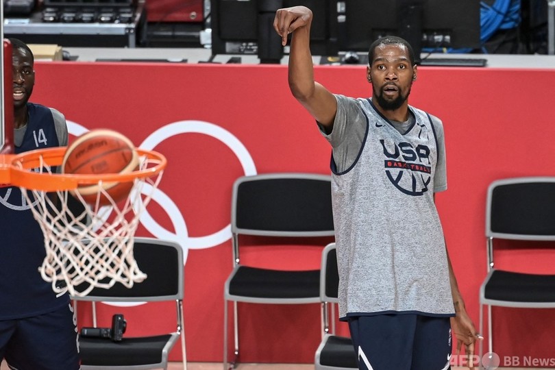 【7月22日 AFP】東京五輪に臨むバスケットボール男子米国代表が22日、大会開幕を控える中、試合会場のさいたまスーパーアリーナ(Saitama Super Arena)でトレーニングを行った。(c)AFP