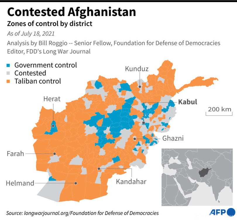アフガニスタンでは米軍や北大西洋条約機構(NATO)軍の部隊撤収がほぼ完了しており、タリバンが各地で勢力を拡大。複数の国境検問所を制圧し、各地の都市を包囲しており、国内に約400ある郡の半分ほどを掌握している。(c)AFP
