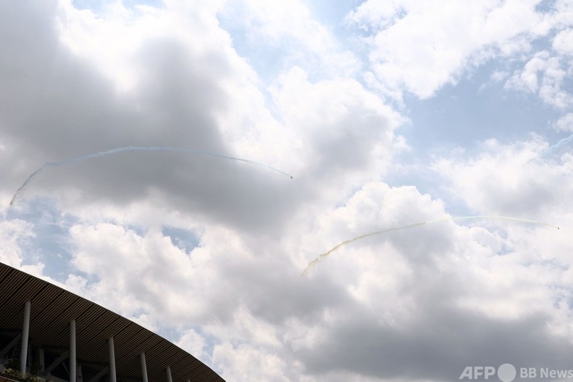 【7月23日 AFP】航空自衛隊のアクロバット飛行チーム「ブルーインパルス(Blue Impulse)」が23日、東京五輪開会式の直前に、東京上空を飛行した。