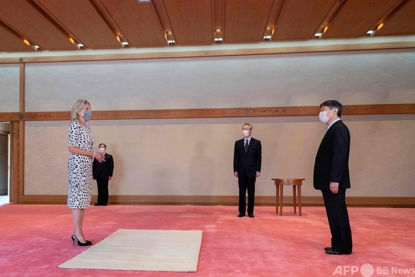 開会式に先立ち、フランスのエマニュエル・マクロン(Emmanuel Macron)大統領、米国のジョー・バイデン(Joe Biden)大統領の妻のジル(Jill Biden)氏、ポーランドのアンジェイ・ドゥダ(Andrzej Duda)大統領らが都内の皇居に赴き、陛下を表敬訪問した。(c)AFP