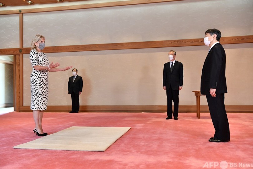 開会式に先立ち、フランスのエマニュエル・マクロン(Emmanuel Macron)大統領、米国のジョー・バイデン(Joe Biden)大統領の妻のジル(Jill Biden)氏、ポーランドのアンジェイ・ドゥダ(Andrzej Duda)大統領らが都内の皇居に赴き、陛下を表敬訪問した。(c)AFP
