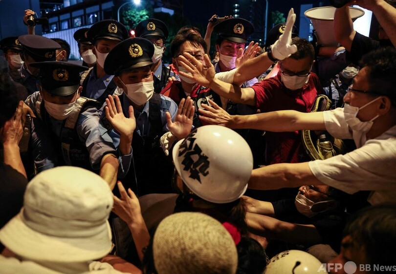 【7月23日 AFP】東京五輪の開会式が行われている国立競技場(Japan National Stadium)の外で23日、大会開催中止を求めるデモが行われ、抗議する人たちの前に多くの警察官が立ちはだかった。