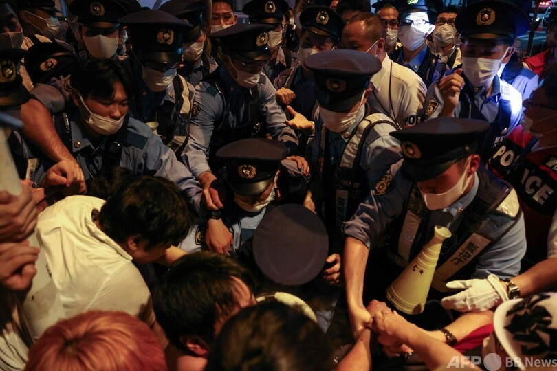 【7月23日 AFP】東京五輪の開会式が行われている国立競技場(Japan National Stadium)の外で23日、大会開催中止を求めるデモが行われ、抗議する人たちの前に多くの警察官が立ちはだかった。