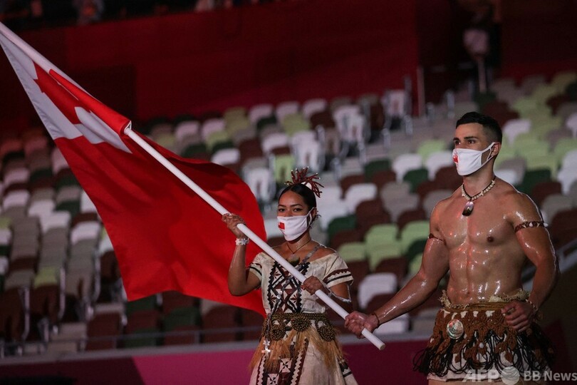 【7月23日 AFP】東京五輪の開会式が23日、国立競技場(Japan National Stadium)で行われ、トンガの入場行進では旗手を務めるピタ・タウファトファ(Pita Taufatofua)が上半身裸で登場した。