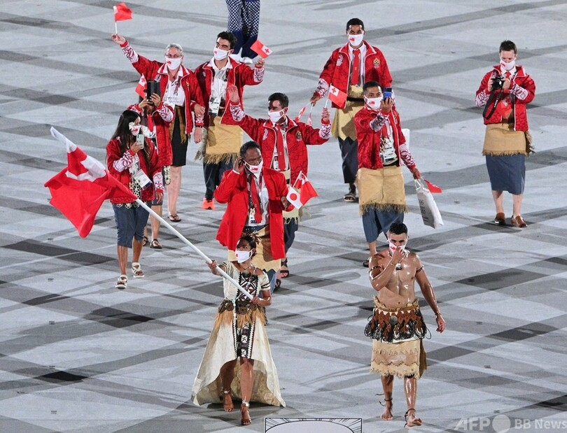 【7月23日 AFP】東京五輪の開会式が23日、国立競技場(Japan National Stadium)で行われ、トンガの入場行進では旗手を務めるピタ・タウファトファ(Pita Taufatofua)が上半身裸で登場した。