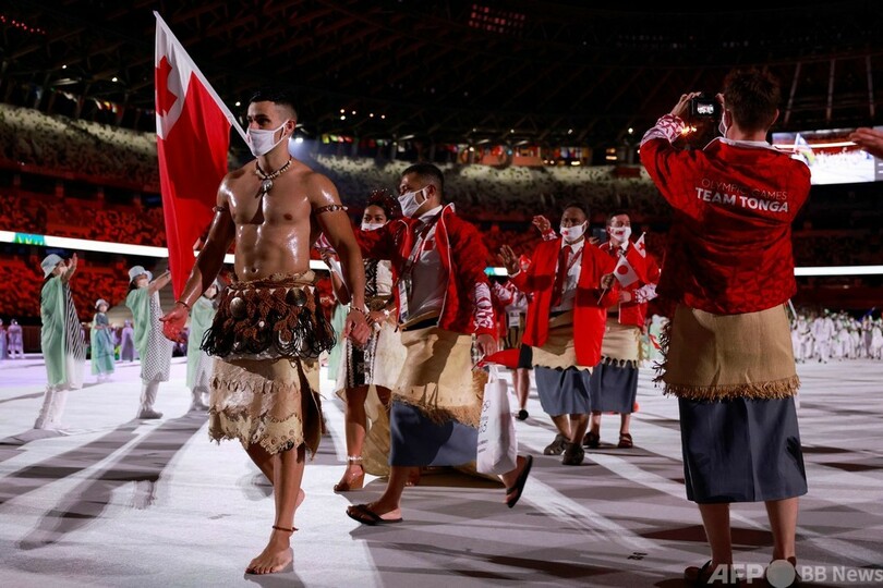 【7月23日 AFP】東京五輪の開会式が23日、国立競技場(Japan National Stadium)で行われ、トンガの入場行進では旗手を務めるピタ・タウファトファ(Pita Taufatofua)が上半身裸で登場した。