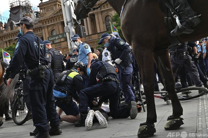 シドニーのデモは公共衛生の規制措置を無視する形で無許可で行われ、数十人が逮捕された。デモは数時間にわたって行われ、デモ隊が警察と衝突する場面もあった。