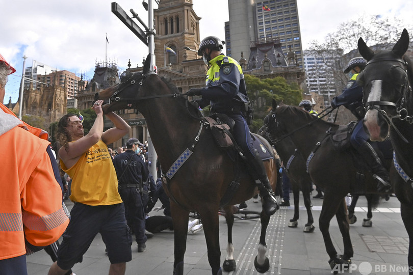 シドニーのデモは公共衛生の規制措置を無視する形で無許可で行われ、数十人が逮捕された。デモは数時間にわたって行われ、デモ隊が警察と衝突する場面もあった。