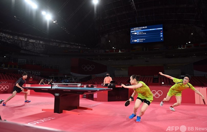 【7月25日 AFPBB News】東京五輪は25日、卓球混合ダブルス準決勝が行われ、水谷隼(Jun Mizutani)/伊藤美誠(Mima Ito)組は4-1で台湾の林昀儒(Yun-ju Lin)/鄭怡静(I-ching Cheng)を下し、26日に行われる決勝に駒を進めた。(c)AFP
