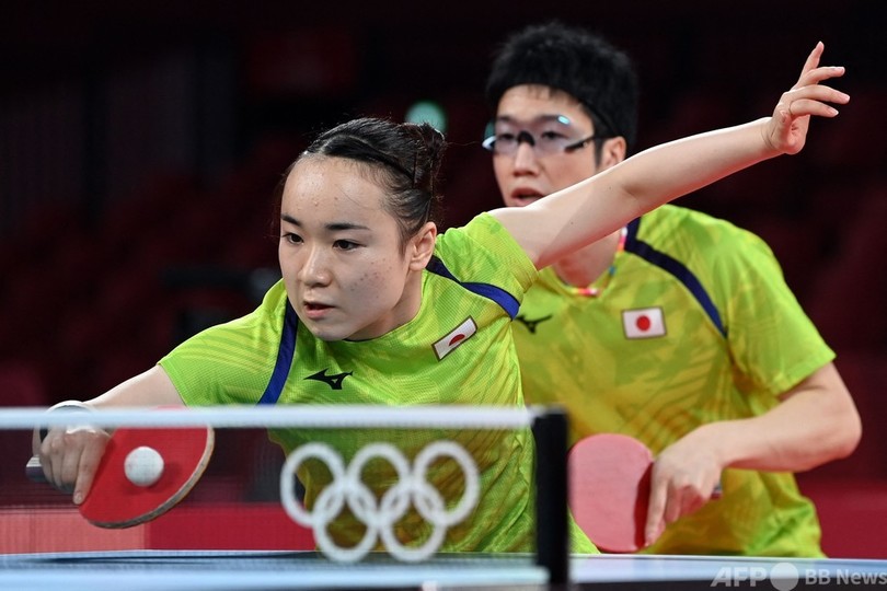 【7月25日 AFPBB News】東京五輪は25日、卓球混合ダブルス準決勝が行われ、水谷隼(Jun Mizutani)/伊藤美誠(Mima Ito)組は4-1で台湾の林昀儒(Yun-ju Lin)/鄭怡静(I-ching Cheng)を下し、26日に行われる決勝に駒を進めた。(c)AFP