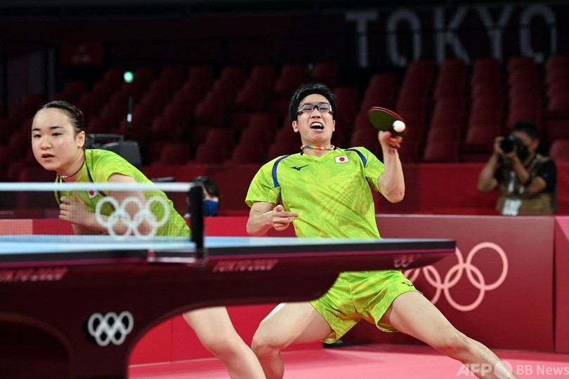 【7月25日 AFPBB News】東京五輪は25日、卓球混合ダブルス準決勝が行われ、水谷隼(Jun Mizutani)/伊藤美誠(Mima Ito)組は4-1で台湾の林昀儒(Yun-ju Lin)/鄭怡静(I-ching Cheng)を下し、26日に行われる決勝に駒を進めた。(c)AFP