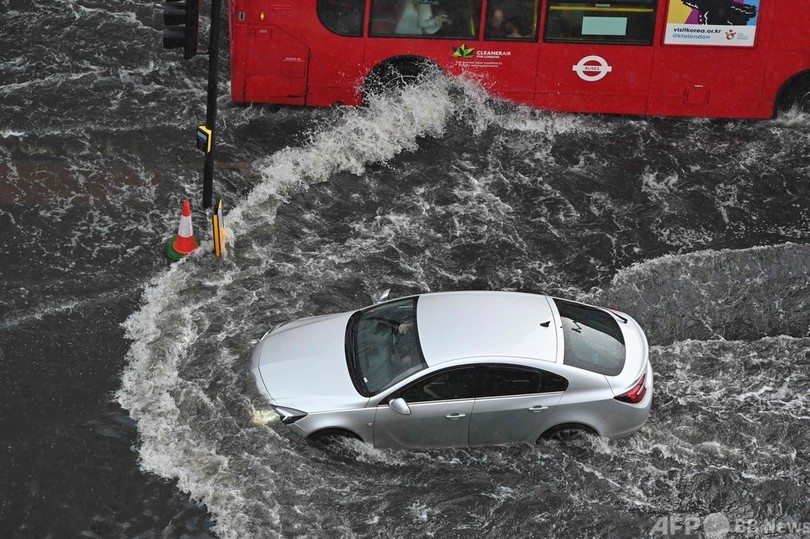 英ロンドン各地で豪雨、道路冠水 2階建てバスも立ち往生
